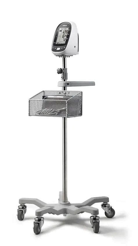 Convenient to move around with 5-wheel mobile stand. Basket to store different sizes cuffs, charts, etc.
