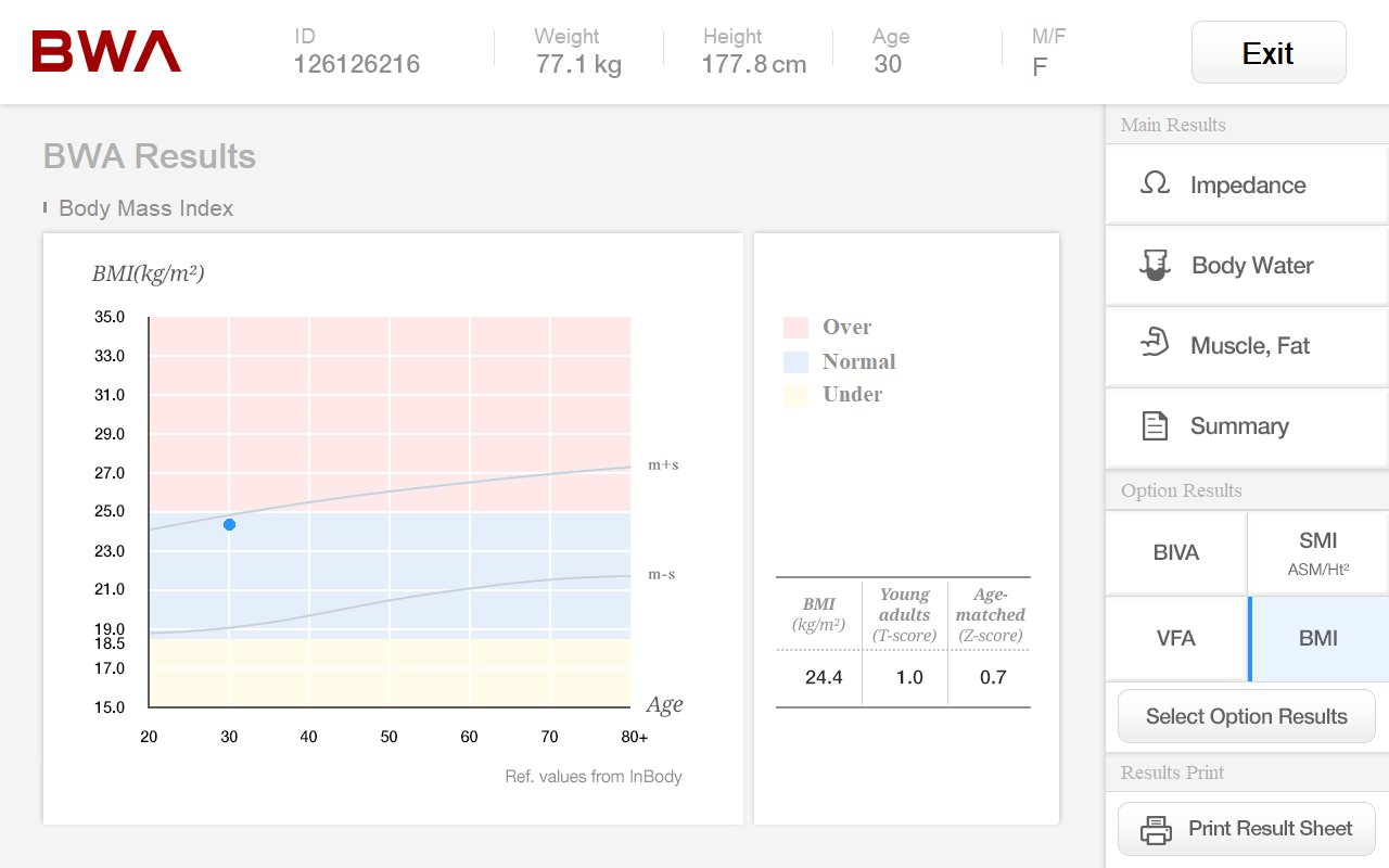 InBody provides body composition evaluation by age, based on globally accumulated InBody Big Data. With this, a comprehensive analysis is provided so that you can compare your data to the data of the young age group (T-score) and the same age group (Z-score).
